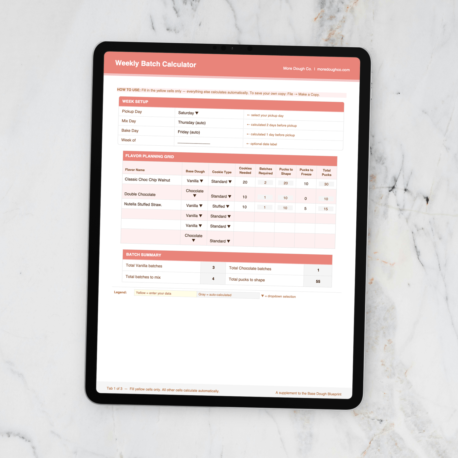 The Weekly Batch Calculator figures it all out for you. Plug in how many cookies you need, what flavors, and your pickup day, and it hands you back your complete prep plan, including: